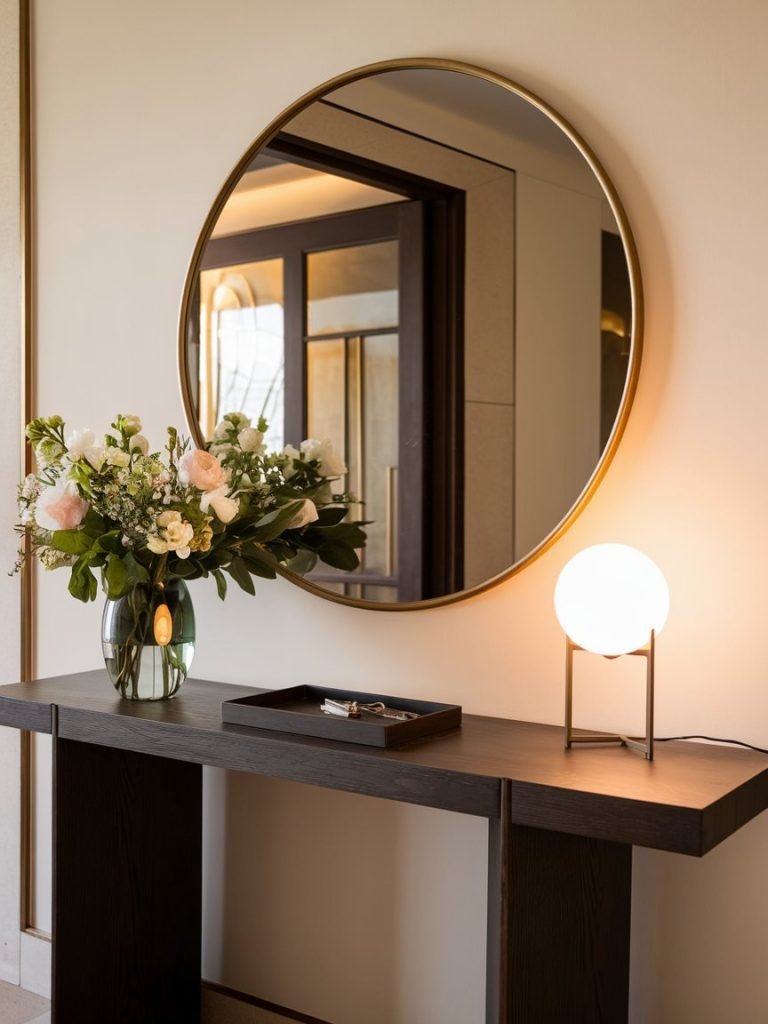 “Um hall de entrada moderno e elegante, com um aparador de madeira escura e um grande espelho redondo com moldura dourada. Sobre o aparador, um vaso com flores frescas, uma bandeja para chaves e um abajur minimalista. O ambiente tem uma iluminação aconchegante e uma parede em tom neutro.”