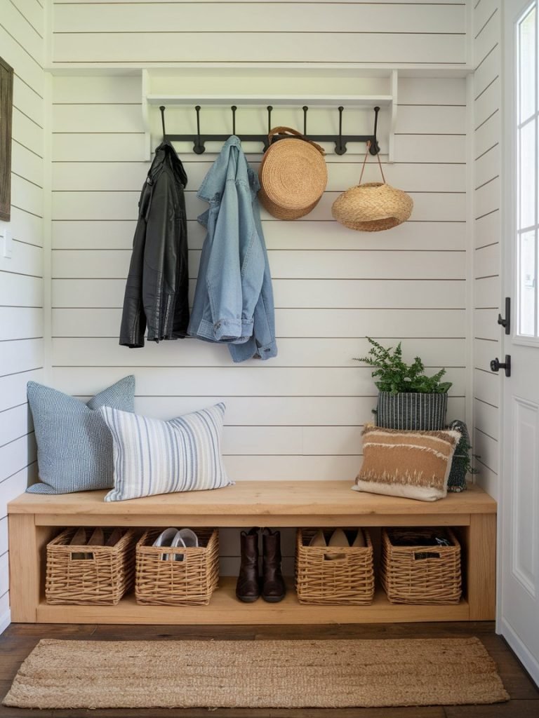 “Um hall de entrada rústico e funcional, com um banco de madeira clara e almofadas confortáveis. Abaixo do banco, cestos de vime organizam sapatos e acessórios. Ao lado, um cabideiro de ferro preto com casacos pendurados e um pequeno tapete de juta para um toque acolhedor.”