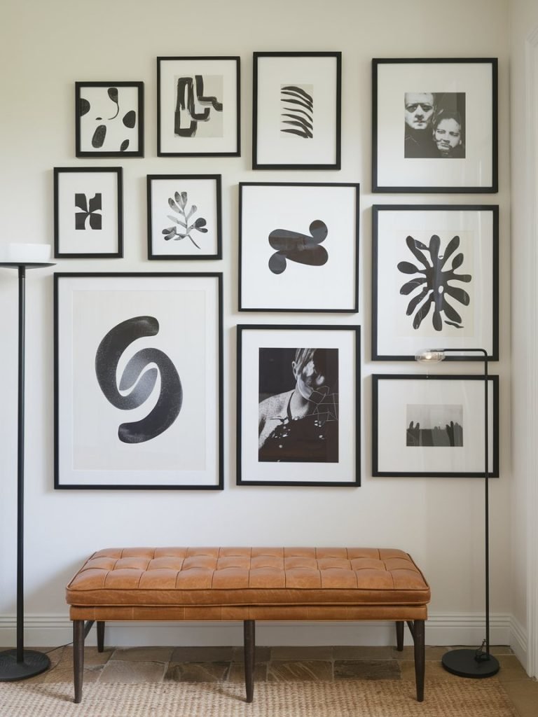 “Um hall de entrada com uma parede decorada por uma galeria de quadros em diferentes tamanhos e molduras pretas. As imagens incluem ilustrações abstratas e fotografias em preto e branco. Um banco de couro marrom e uma luminária de chão complementam o espaço.”