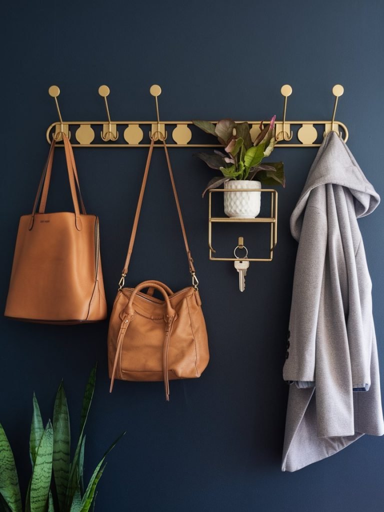 “Um hall de entrada funcional e organizado, com um conjunto de ganchos dourados fixados em uma parede azul-marinho. Bolsas e casacos pendurados, e uma pequena prateleira flutuante abaixo dos ganchos com porta-chaves e uma plantinha decorativa.”