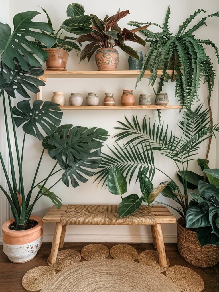 “Um hall de entrada cheio de vida, decorado com plantas tropicais como costela-de-adão, zamioculcas e samambaias. Uma prateleira de madeira abriga pequenos vasos cerâmicos. O espaço tem um banco rústico e um tapete de fibra natural para um toque boho.”