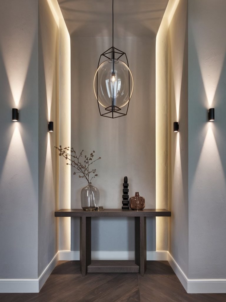 “Um hall de entrada elegante e moderno com iluminação indireta. Um pendente de vidro e metal preto ilumina um aparador minimalista. Pequenos spots embutidos criam um efeito aconchegante na parede texturizada. O piso de madeira escura contrasta com a paleta clara das paredes.”