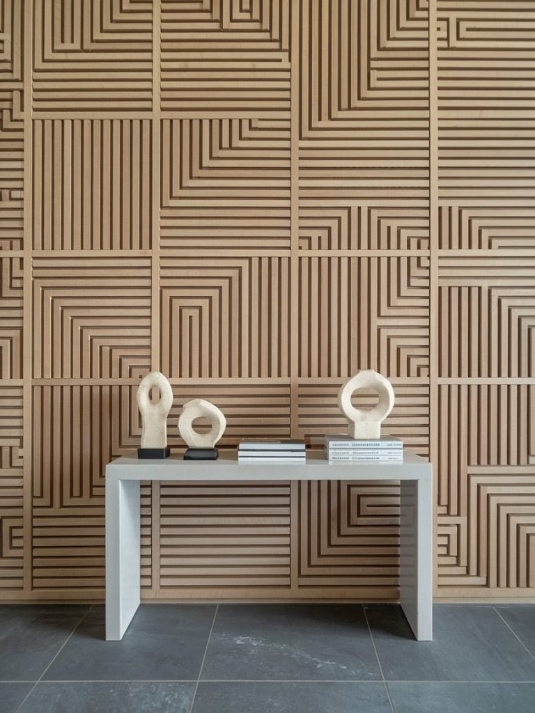 “Hall de entrada moderno com um painel ripado de madeira clara ocupando toda a parede. Na frente do painel, um aparador branco com objetos decorativos sofisticados, como esculturas minimalistas e livros empilhados. O piso de porcelanato cinza dá um ar elegante e clean.