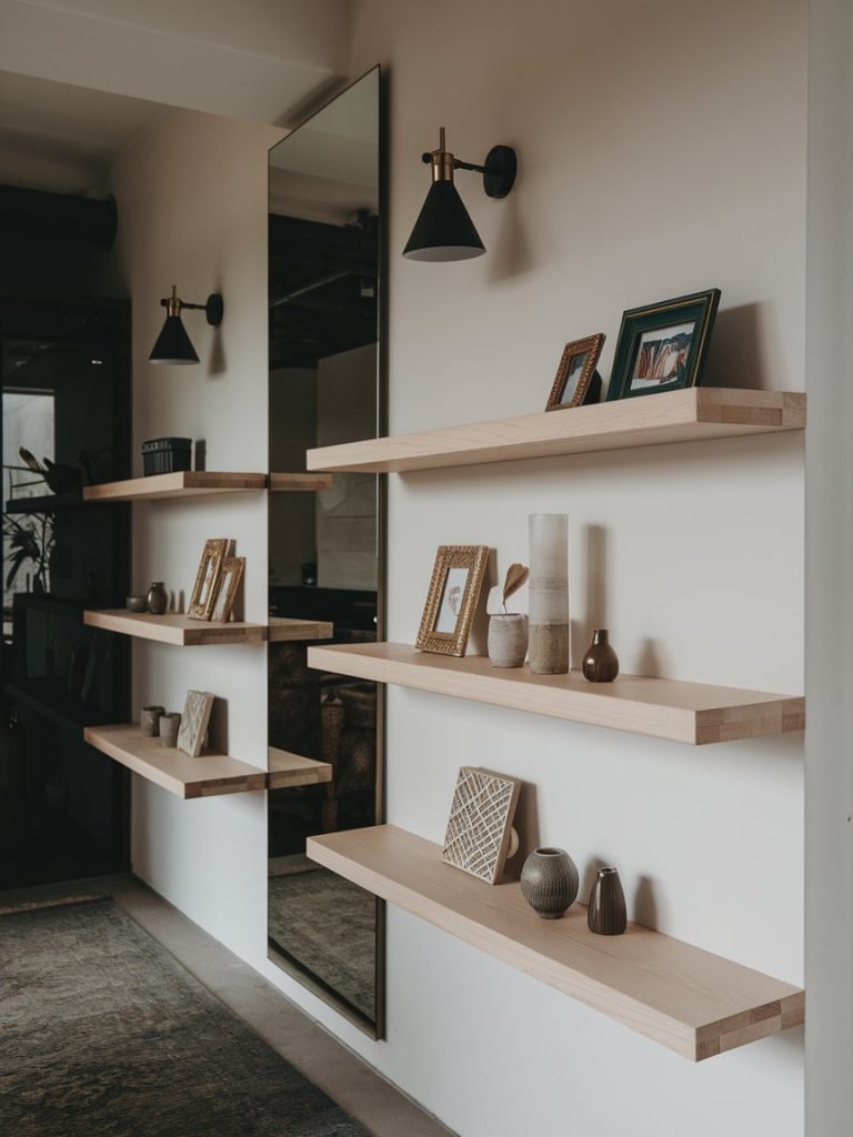 “Hall de entrada moderno e compacto, com prateleiras flutuantes de madeira clara fixadas na parede branca. Sobre as prateleiras, quadros decorativos, vasos pequenos e uma luminária de parede com design contemporâneo.”