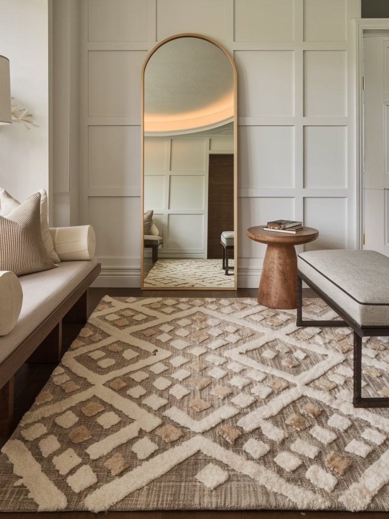 “Um hall de entrada sofisticado e aconchegante, com um tapete grande e macio de estampa geométrica em tons neutros. Um espelho de corpo inteiro está encostado na parede, refletindo a iluminação suave. Um banco acolchoado e uma mesa lateral de madeira completam o espaço.“