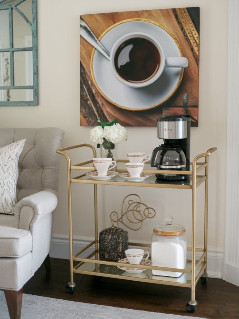 “Hall de entrada charmoso e sofisticado com uma pequena estação de café. Um carrinho de metal dourado e vidro com cafeteira, xícaras elegantes e potes de café e açúcar. Ao lado, uma poltrona confortável e um quadro decorativo de café na parede.”